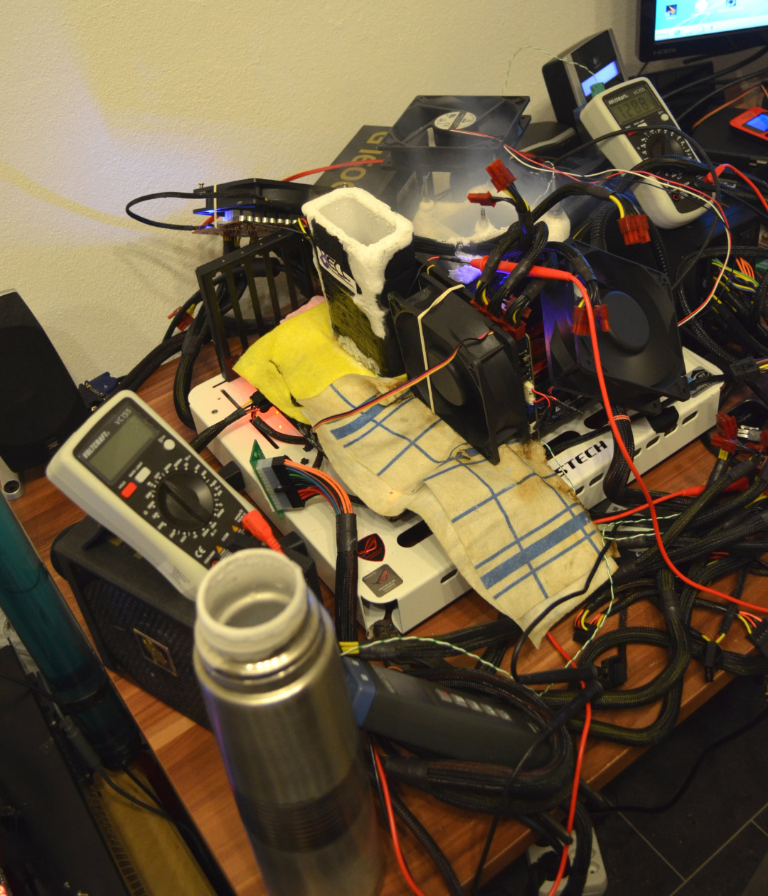 Немец задействовал в составе стенда шестиядерный процессор Intel Core i7-4930K (@6,19 ГГц), материнскую плату Asus Rampage Black Edition (X79), 16 ГБ (4 x 4 ГБ) оперативной памяти G.Skill TridentX DDR3 @2750 МГц, блоки питания от Lepa и Seasonic, SSD-накопитель Adata Premiere Pro SP900 и, разумеется, испарители с жидким азотом.