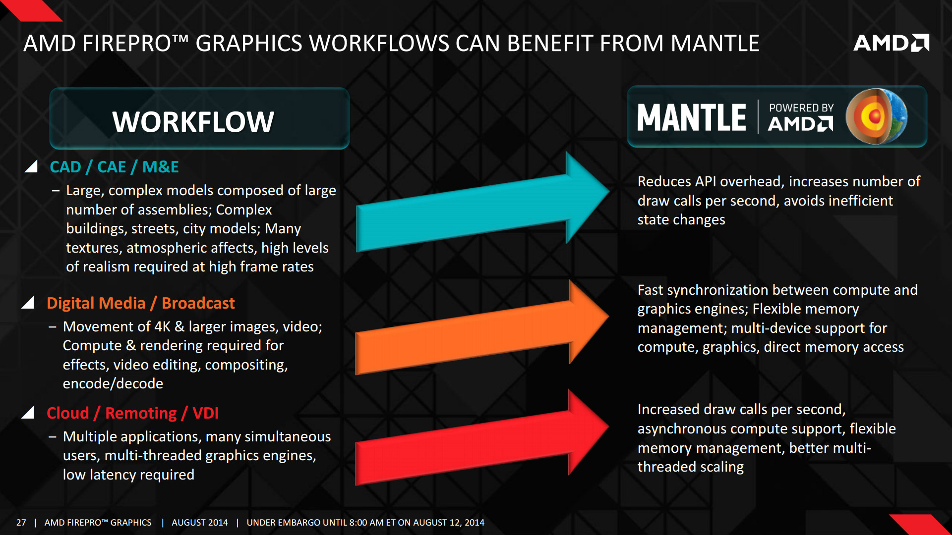 AMD акцентирует внимание потенциальных клиентов на поддержке новыми FirePro интерфейса программирования приложений Mantle, способного практически «на ровном месте» повысить производительность системы.