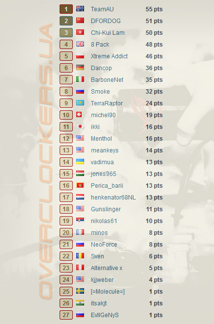 Отметим, что украинский оверклокер Вадим «Vadimua» Яценко финишировал 14-м, обойдя таких именитых соперников, как Perica_barii (Черногория) и Gunslinger (США).