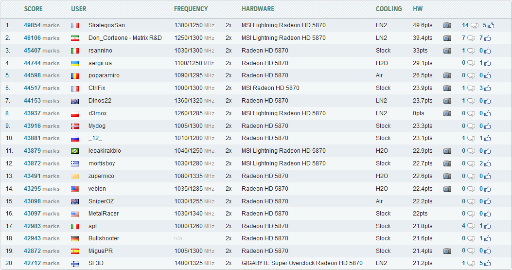 Самый результативный новичок лиги соревновательного бенчмаркинга HWBot Сергей «Sergii.ua» Коркин добился отличного результата в разгоне CrossFireX-конфигурации из двух видеокарт Radeon HD 5870. Свидетельством тому является четвертое место Сергея в дисциплине 3DMark Vantage/Performance 2xGPU (44744 очка) среди карт HD 5870.