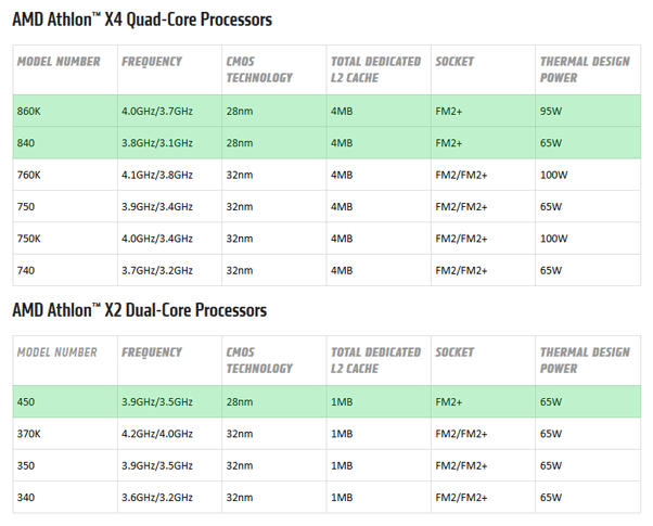 Старший из вышеперечисленных CPU — четырехъядерный Athlon X4 860K — имеет свободный множитель, работает на частоте от 3,7 ГГц (обычный режим) до 4,0 ГГц (турборежим), оснащен 4 МБ (2 x 2 МБ) кэш-памяти второго уровня, двухканальным контроллером оперативной памяти DDR3 и характеризуется тепловым пакетом 95 Вт.
