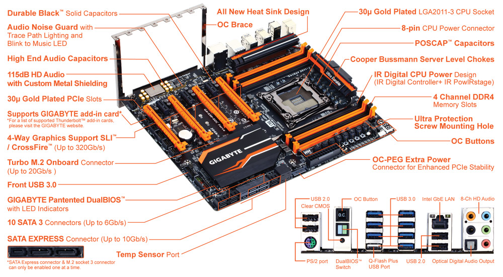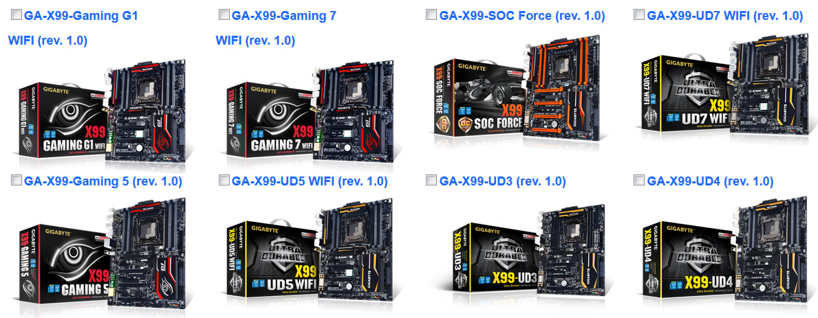 Последовав примеру Asus и MSI, компания Gigabyte выпустила множество разнообразных моделей материнских плат для дебютных процессоров Intel Haswell-E — Core i7-5960X, Core i7-5930K и Core i7-5820K. В первую волну вошли восемь плат: GA-X99-SOC Force для экстремальных оверклокеров, GA-X99-Gaming G1 WiFi, GA-X99-Gaming 7 WiFi и GA-X99-Gaming 5 для геймеров, а также GA-X99-UD7 WiFi, GA-X99-UD5 WiFi, GA-X99-UD4 и GA-X99-UD3 для основной массы пользователей.