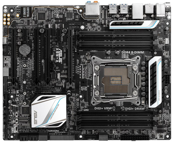 Новинка, по сравнению с собратьями, имеет базовый набор характеристик, тем не менее стоит выделить наличие разъемов M.2 (для PCI-E SSD) и SATA Express, аудиоподсистемы Crystal Sound 2 на базе контроллера Realtek ALC1150 и десяти каналов USB 3.0 (шесть портов на задней панели). Помимо этого, Asus X99-A допускает установку процессоров Core i7-5800/5900, восьми модулей оперативной памяти DDR4-2133/.../3200 общим объемом до 64 ГБ, трех видеокарт Nvidia или AMD (SLI/CrossFireX по формуле x16/x16/x8).