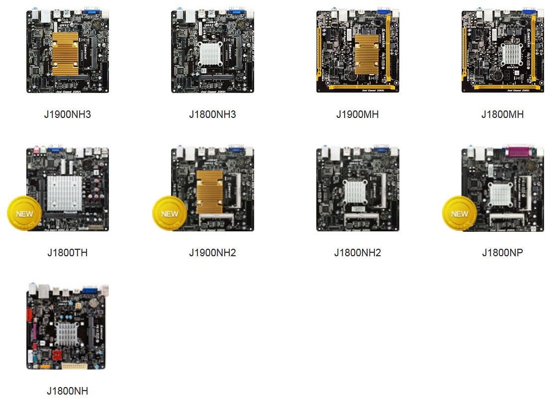 В ассортименте плат числятся модели с разъемами PCI Express 2.0 x16 или PCI-E 2.0 x1, одним-двумя слотами для оперативной памяти DIMM DDR3 или SO-DIMM DDR3, пассивным охлаждением CPU различного цвета (золотистый радиатор указывает на использование SoC Celeron J1900) и размера. Почти все устройства оснащены портом USB 3.0, видеовыходами HDMI и D-Sub. На общем фоне выделяется плата Biostar J1800TH, выполненная в форм-факторе Thin Mini-ITX. В свою очередь, модель J1800NP примечательна совместимостью с LPT-периферией.