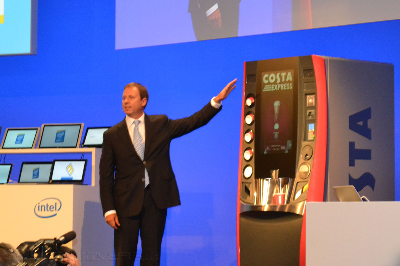 В качестве примера такого сотрудничества Скауген привел кофейный автомат компании Costa, работающий на процессоре Intel Core 7 последнего поколения, необходимого ему для непрерывной обработки и передачи данных об объемах продаж в центральный офис в режиме реального времени. Сеть таких автоматов на глобальном и локальном уровне самостоятельно корректирует графики и объемы поставок расходных материалов и перераспределение излишков в зависимости от колебаний спроса в отдельных районах.