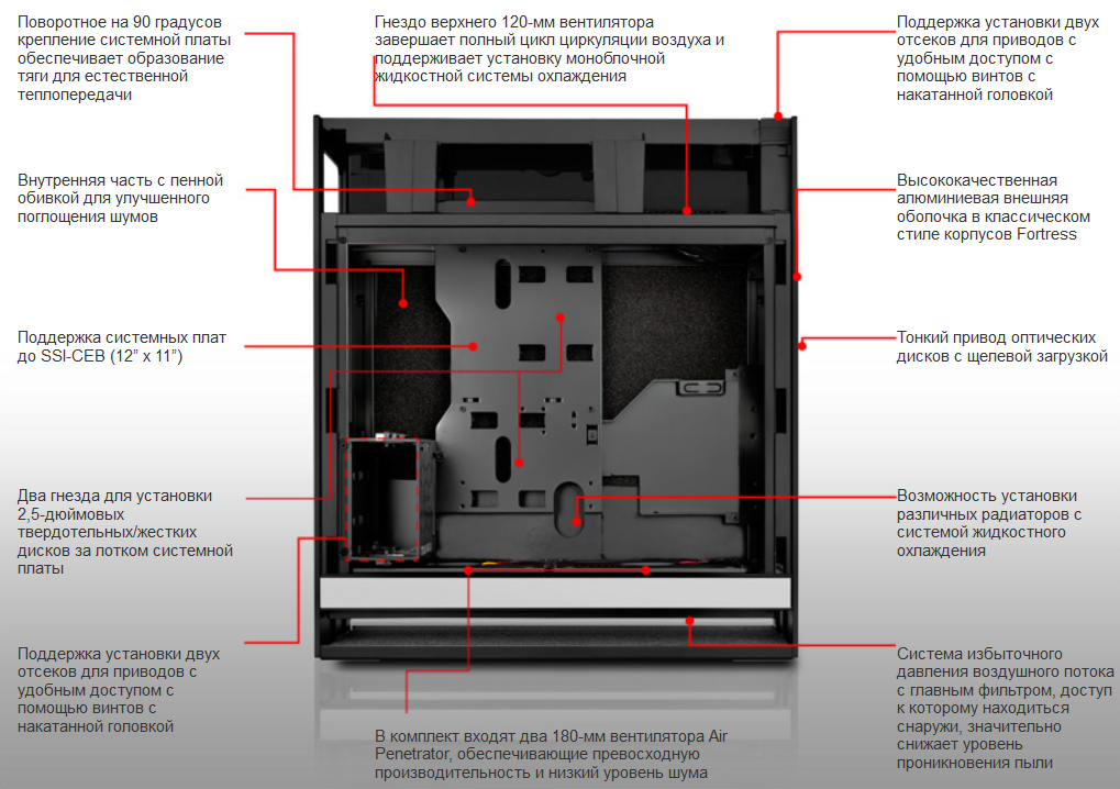 Новинка весит 9,5 кг при габаритах 427(Д) x 221(Ш) x 483(В) мм и позволяет разместить следующие комплектующие: материнскую плату форм-фактора SSI-CEB, ATX или microATX, процессорный кулер высотой до 162 мм, семь карт расширения длиной до 312 мм и шириной до 166 мм, ATX-совместимый блок питания, по два 3,5-дюймовых и 2,5-дюймовых накопителя, а также слотовый оптический привод. В комплект поставки включены два вентилятора SilverStone Air Penetrator AP181, работающие в режимах 600 об/мин (17 дБА), 900 об/мин (25 дБА) и 1200 об/мин (34 дБА).