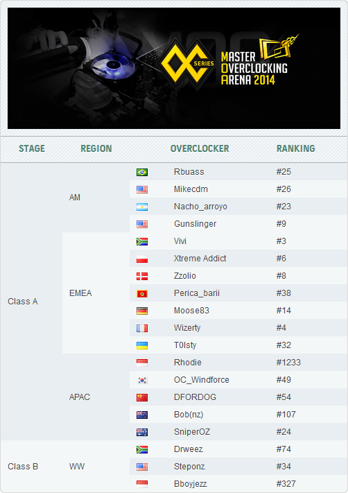 Наряду с T0lsty серьезными претендентами на победу являются: бразилец Роналдо «Rbuass» Буассали, представитель африканского континента Готфрид «Vivi» Роодт, поляк Михал «Xtreme Addict» Вобожил и южнокорейский мастер разгона OC_Windforce. Как обычно, не обойдется без сюрпризов, ведь кому-то из «темных лошадок» обязательно попадется набор комплектующих, превосходящий по своим возможностям большинство остальных.