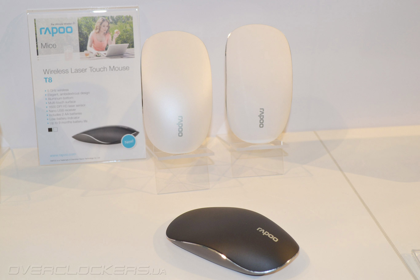 Из беспроводных мышей привлекло внимание лишенное кнопок сенсорное устройство Rapoo T8, являющееся аналогом Apple Magic Mouse или Microsoft Touch Mouse, но особенно напоминающее Logitech T620. Форма T8 стала гораздо удобнее в сравнении с ее предшественницей Т6. Будем надеяться, что и в работе она покажет себя получше.