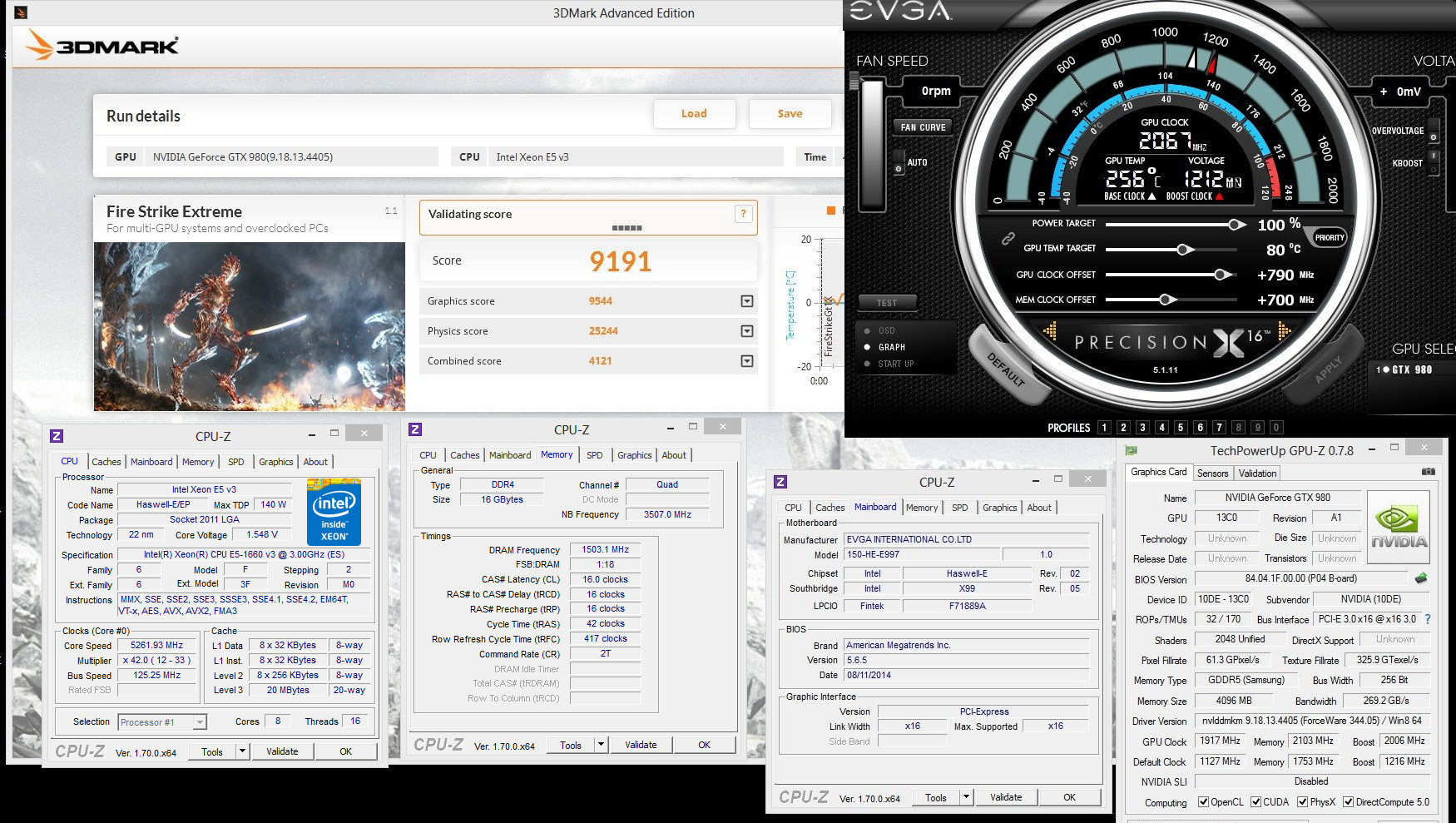Рекордсмены использовали материнскую плату EVGA X99 FTW, блок питания мощностью 1600 Вт и непосредственно адаптер EVGA GeForce GTX 980, разогнанный до 2067/8024 МГц для ядра/памяти соответственно. Беспрецедентно высокая частота позволила получить в бенчмарке 3DMark Fire Strike 19040 очков, а в Fire Strike Extreme — 9191.