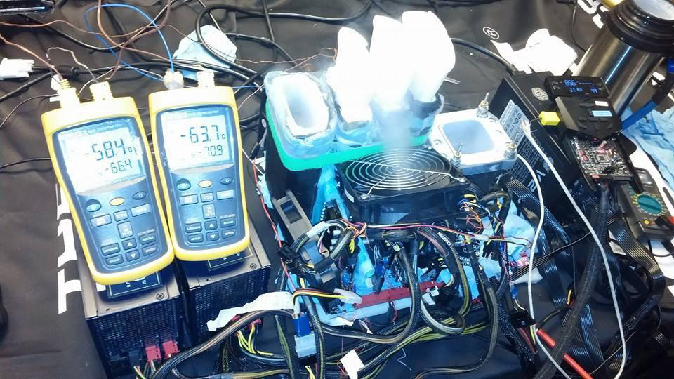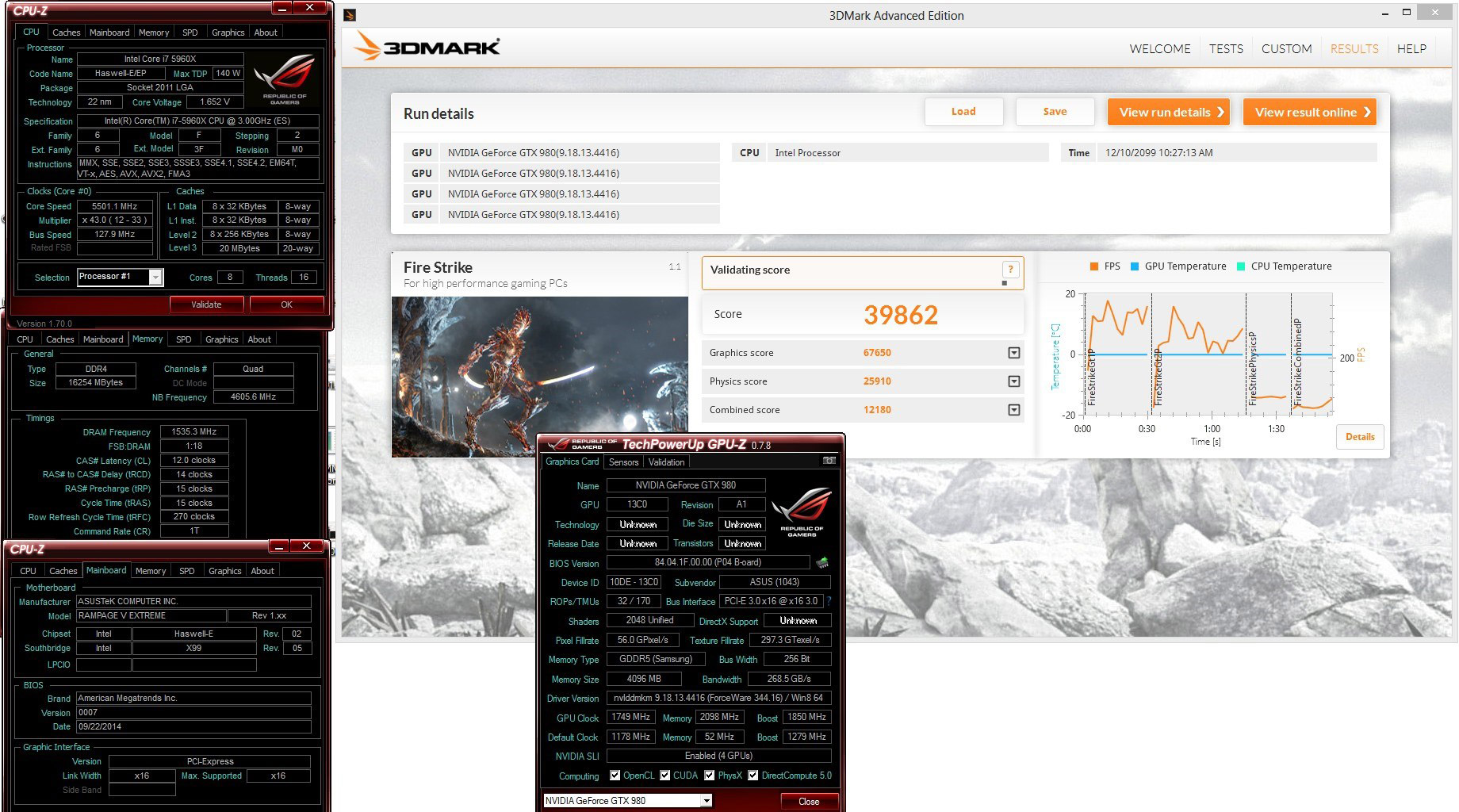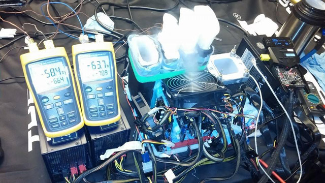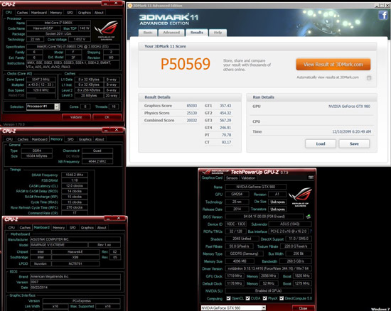 Максимальный разгон квартета GeForce GTX 980 составил 1900/8392 МГц (ядро/память). Тесты проводились в среде ОС Windows 7 (64-бит) с использованием пакета драйверов GeForce 344.16. Стенд был собран из вышеупомянутых видеоадаптеров на чипе Nvidia GM204, материнской платы Asus Rampage V Extreme (чипсет X99), процессора Intel Core i7-5960X, 16 ГБ оперативной памяти G.Skill DDR4, нескольких блоков питания и пяти испарителей для жидкого азота. В ходе серии экспериментов был задействован гаджет ROG OC Panel.
