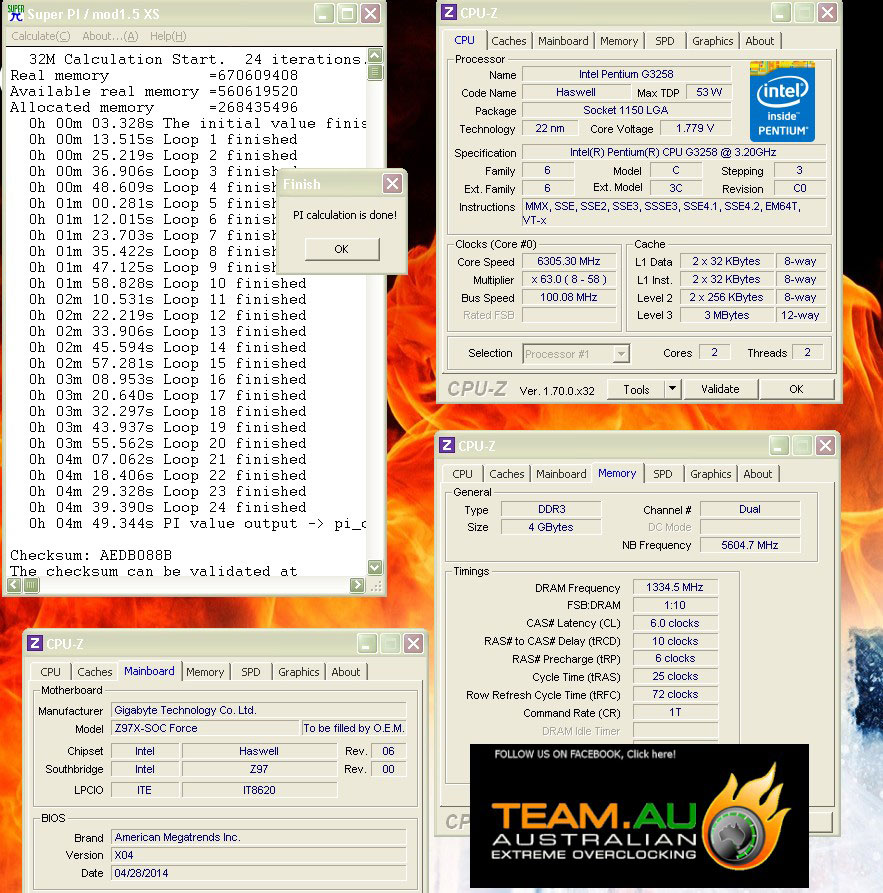 Австралийский участник Dinos22 показал лучший результат в тесте SuperPi 32M среди моделей G3258 — 4 мин. 49 с 344 мс. Ключом к успеху стала память на чипах PSC, которая смогла работать в режиме DDR3-2669 с таймингами 6-10-6-25 и Command Rate 1T. Частота процессора достигала 6319 МГц.
