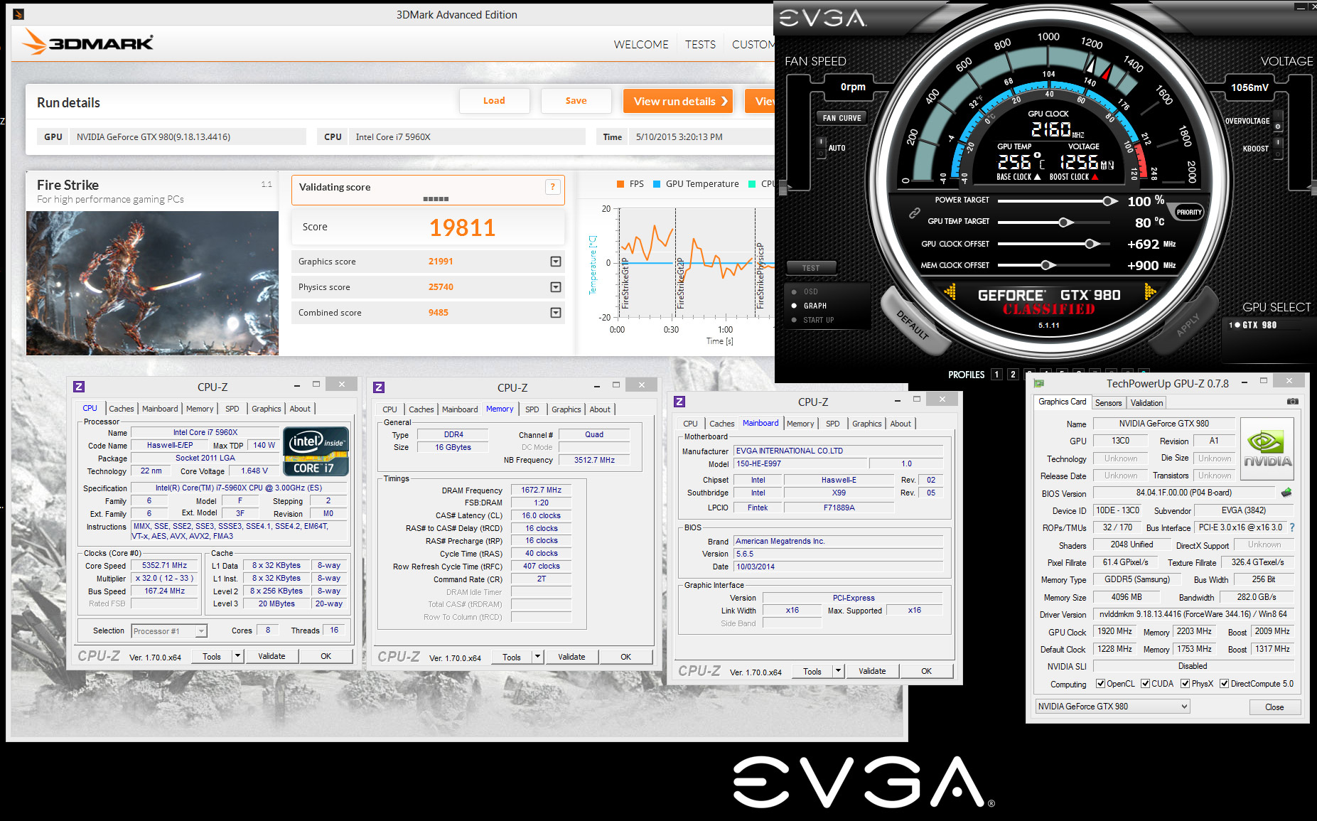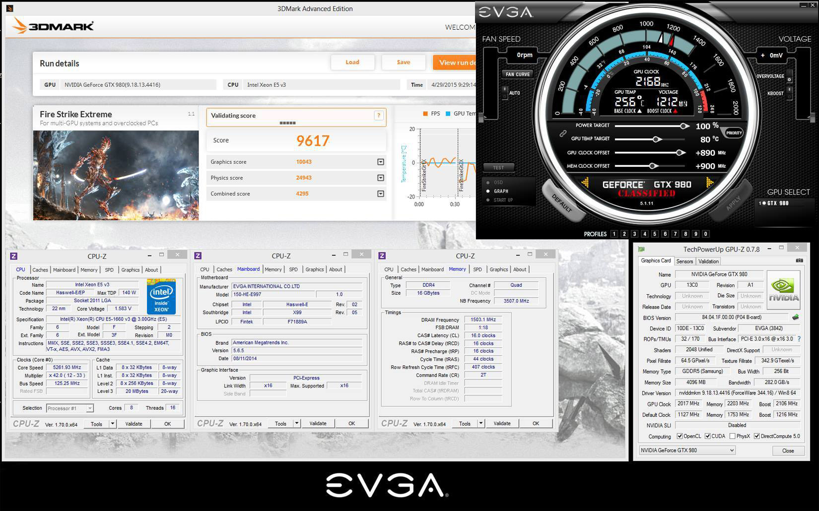 Не последнюю роль в достижении высоких результатов сыграли материнская плата EVGA X99 Classified, 8-ядерный процессор Intel Core i7-5960X, оперативная память G.Skill Ripjaws IV DDR4 и видеокарта EVGA GeForce GTX 980 Classified.