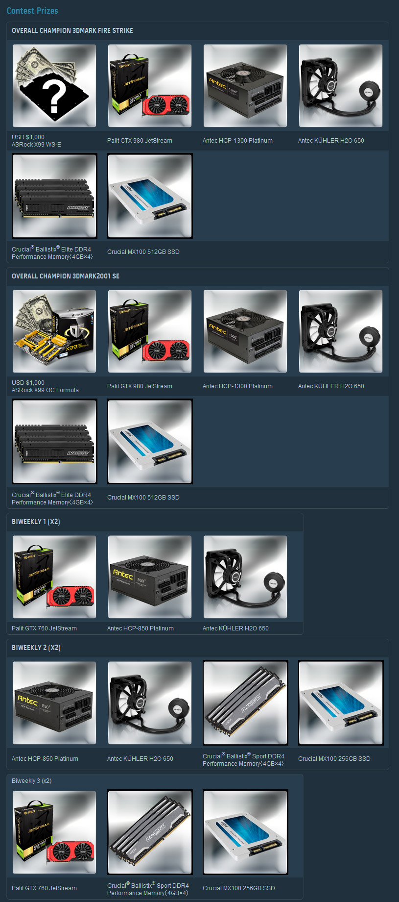Ценные призы совокупной стоимостью до $2800 получат те, кто опередит конкурентов в одном из бенчмарков. Абсолютный чемпион также будет вознагражден чеком на $500. Дополнительный бонус в размере 500 долларов будет присужден автору мирового рекорда в тесте 3DMark Fire Strike 1xGPU. Тому, кто победит в соревновании, использовав комплектующие марок Antec, Crucial и/или Palit, полагается по $300 от каждого из партнеров. Таким образом, большой 2800-долларовый куш может теоретически вырасти до $4700.