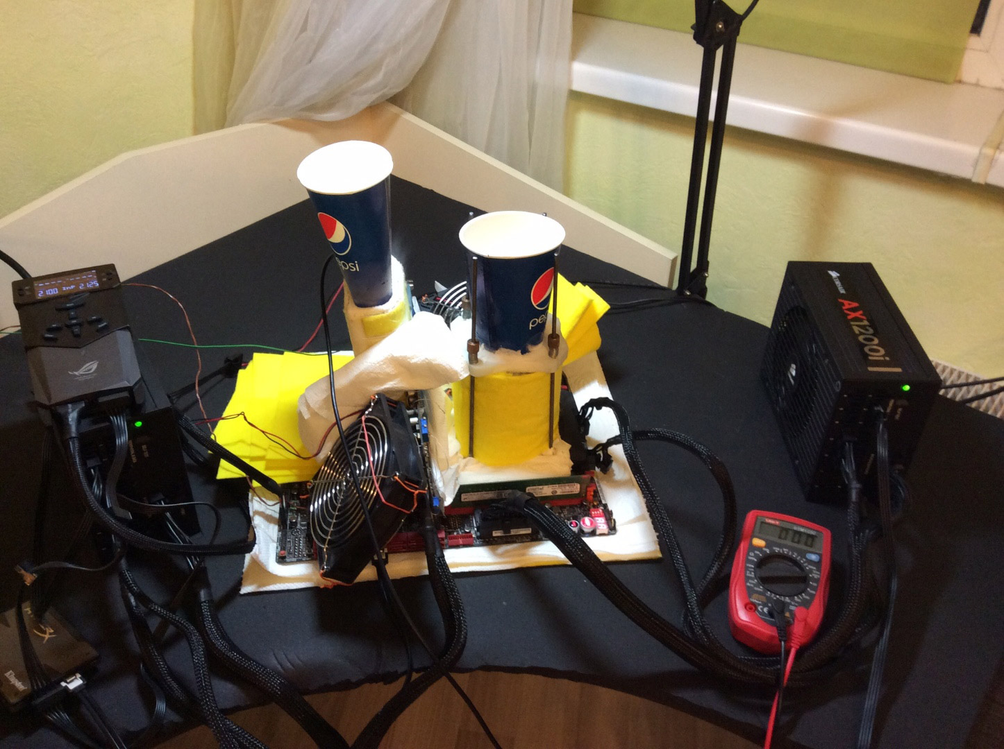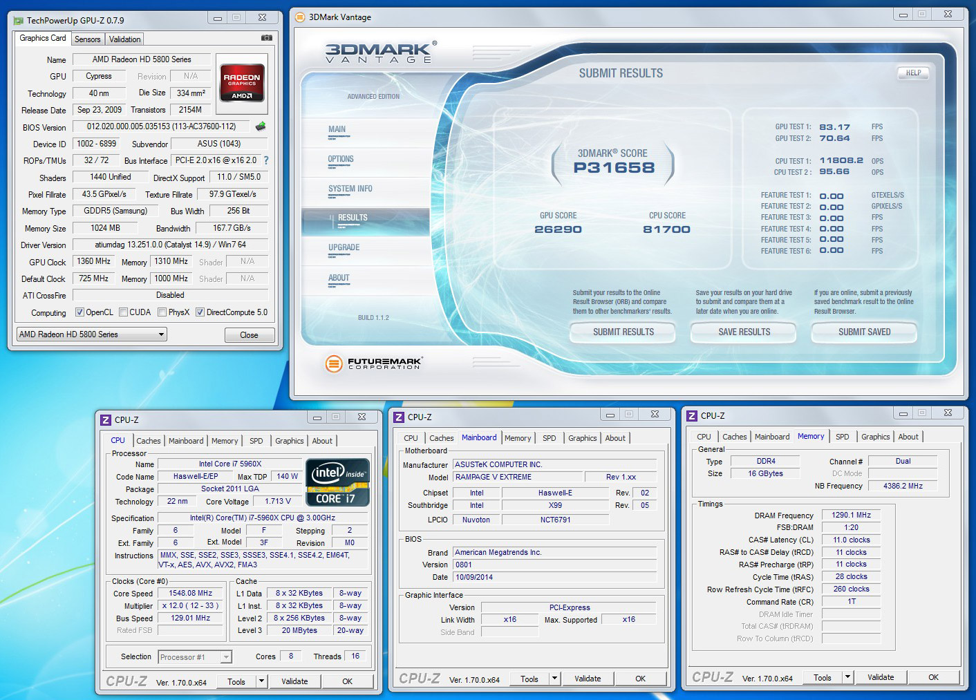 Тестирование проводилось с использованием материнской платы Asus V Rampage Extreme (X99), процессора Intel Core i7-5960X (@5676 МГц), 16 ГБ оперативной памяти DDR4 (@2580 МГц), блока питания Corsair AX1200i и гаджета ROG OC Panel. Автор рекорда отметил, что его экземпляр Asus HD 5850 DirectCU может собрать еще больше наград, если представится шанс поэкспериментировать с ним на платформе LGA1150 с четырехъядерным Core i7-4770K.