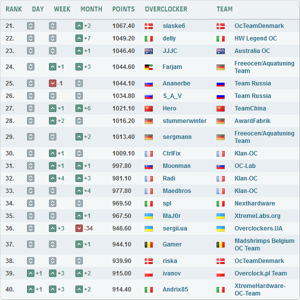 Отметим, что Сергей поднялся на 36 место в Лиге экстремальных оверклокеров HWBot. Набрав, к примеру, 100 глобальных очков, наш мастер разгона может подняться на 23 место, оставив позади таких известных личностей, как JJJC, Ananerbe, S_A_V, Hero, Stummerwinter, Moonman, Maedhros и MaJ0r.