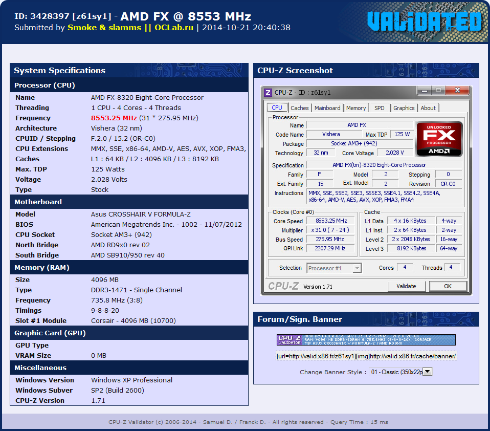 В течение года российские оверклокеры неоднократно тестировали процессоры AMD FX, пытаясь обнаружить «золотой» экземпляр восьмиядерника с разгонным потенциалом свыше 8,5 ГГц. В итоге Smoke, Slamms и Atheros определили потенциального CPU-рекордсмена — им оказался FX-8320. Для разгона данного чипа до 8553,25 МГц Владимир «Smoke» Георгиев и Владислав «slamms» Захаров использовали материнскую плату Asus Crosshair V Formula-Z (чипсет 990FX, версия UEFI 1002), экстремальное охлаждение и блок питания Antec High Current Pro 1300W. Напряжение на четырех активных ядрах повышалось до 2,03 В, опорная частота составляла почти 276 МГц, множитель CPU — 31x.