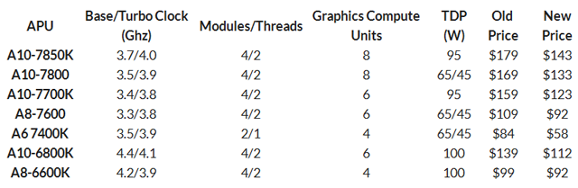 Кроме вышеперечисленных APU, стали дешевле чипы начального уровня A4-6300 (Richland FM2), A4-5300 (Trinity FM2) и A4-4400 (Richland FM2). С этой недели они стоят соответственно $34, $27, $27. Не исключено, что уценке подверглись и другие решения, поэтому рекомендуем заглянуть в актуальный прайс-лист AMD APU. В нем указана стоимость гибридных процессоров в оптовых партиях от 1000 ед.