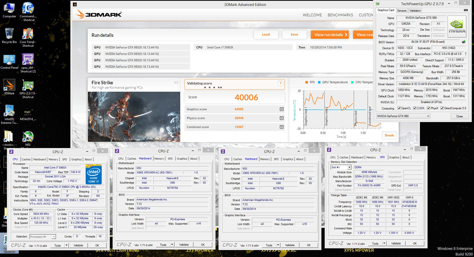 Как обычно, 8 Pack сосредоточился на 3D-бенчмарках, набрав 40006 «попугаев» в 3DMark Fire Strike с 4-Way SLI. Четыре видеокарты MSI GeForce GTX 980 Gaming были задействованы и в тестах 3DMark 11 (44538 очков) и 3DMark Vantage (109069 очков). Максимальный разгон ядра и памяти квартета GTX 980 составил 2000/8012 МГц, частота процессора Intel Core i7-5960X в графических подтестах повышалась до 5750 МГц.