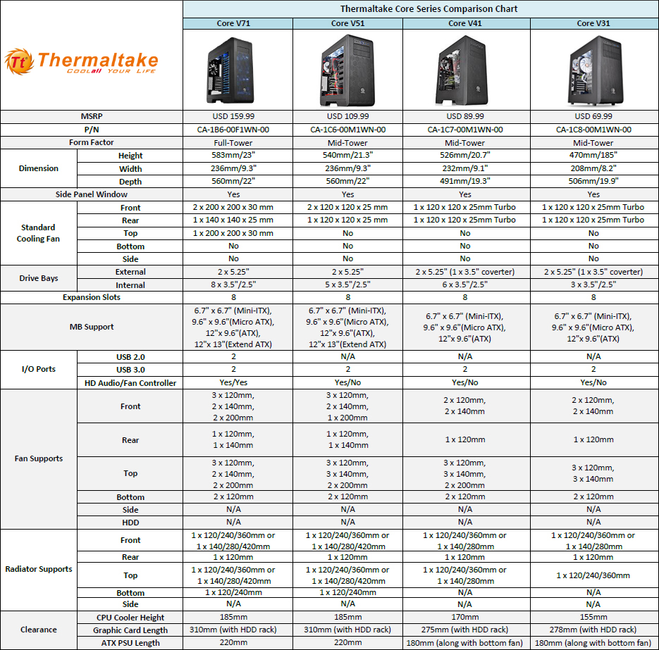 Ниже приведены подробные характеристики всех корпусов Thermaltake линейки Core:
