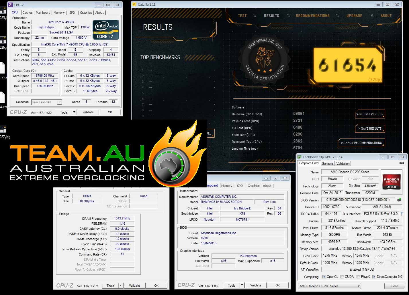 TeamAU разогнали процессор до 5,8 ГГц при напряжении 1,68 В, эффективная частота четырех 4 ГБ модулей оперативной памяти G.Skill TridentX DDR3 составляла 2687 МГц (тайминги 9-12-12-20), частотные параметры видеокарты — 1275/6300 МГц (ядро/память). Тестирование проводилось на материнской плате Asus Rampage IV Black Edition, базирующейся на чипсете Intel X79. Операционной системой служила 64-битная Windows 7 (версия драйвера Catalyst — 13.11).