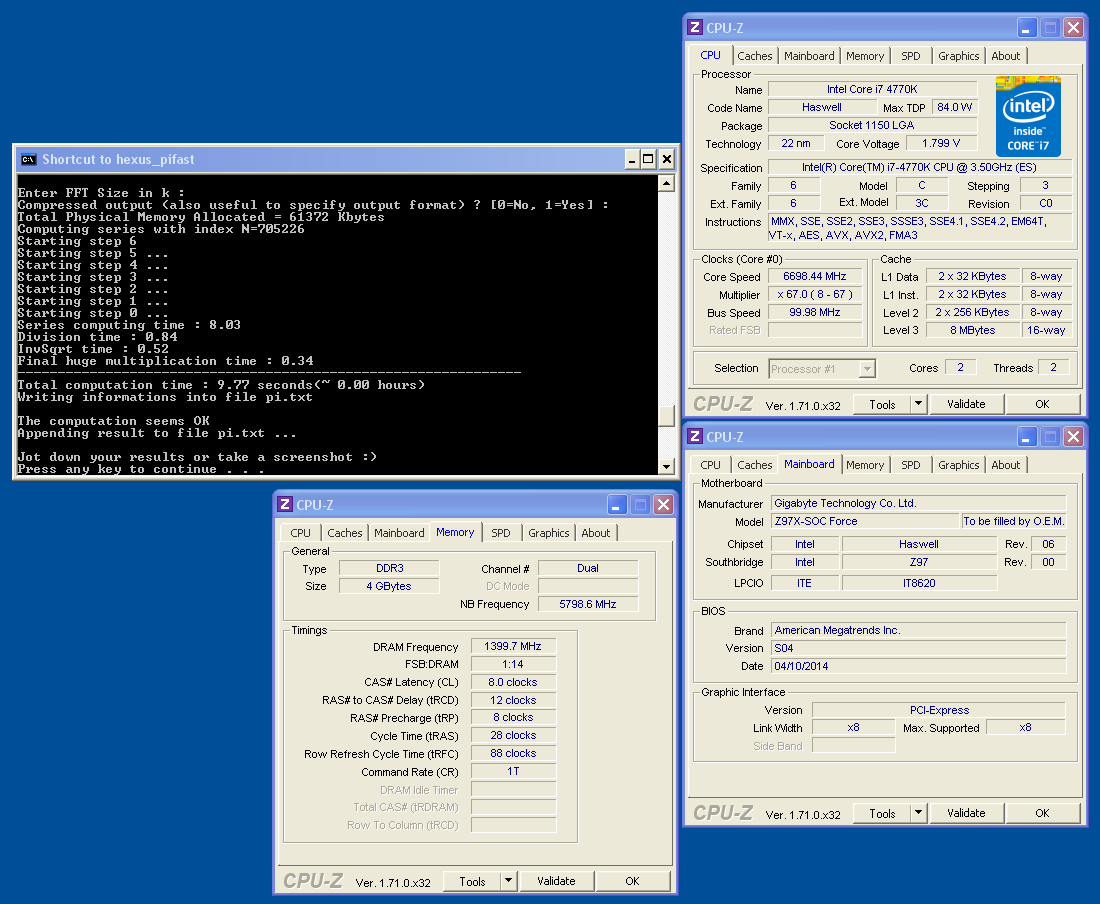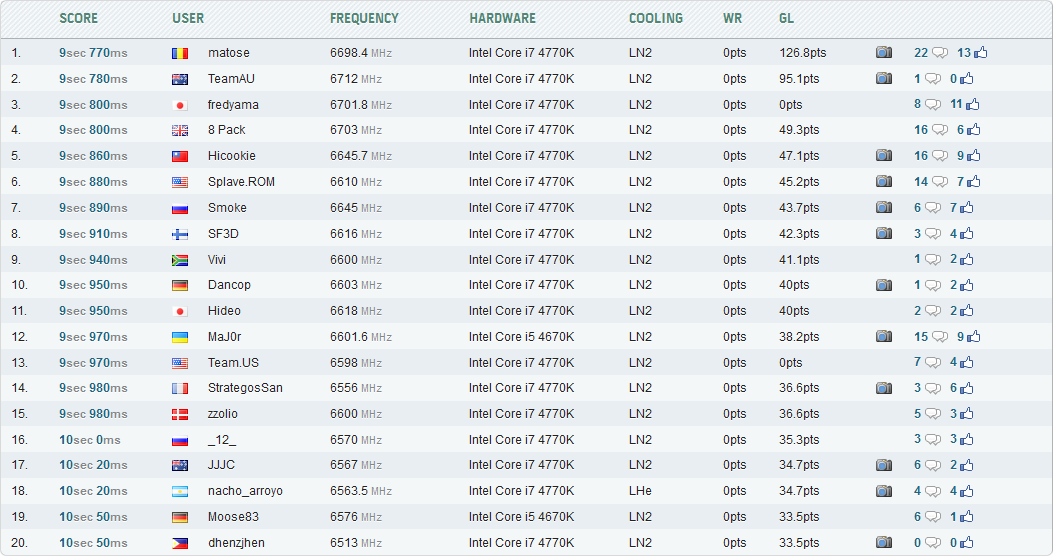 Новый ориентир (9,770 с) был установлен с помощью отборного экземпляра процессора Intel Core i7-4770K, который разогнался под жидким азотом до 6698 МГц. Стенд был основан на материнской плате Gigabyte GA-Z97X-SOC Force LN2. К ней были подсоединены две планки оперативной памяти Kingston HyperX DDR3 @2800 МГц (задержки 8-12-8-28), видеокарта марки Galaxy (возможно, GeForce GT 630 Icescale, раскрашенная в цвета румынского флага), SSD-накопитель Kingston HyperX 240 ГБ и 1200-ваттный блок питания.