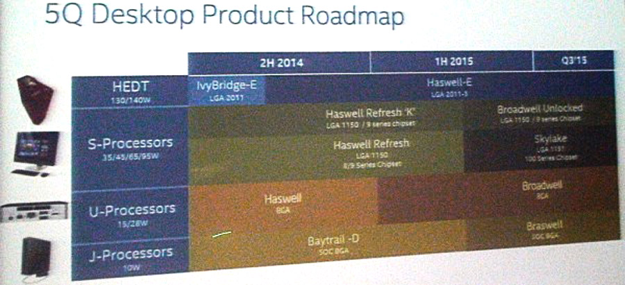 Накануне веб-ресурс Hardware.info опубликовал новую технологическую дорожную карту Intel, якобы продемонстрированную на одной из закрытых презентаций компании. Согласно ей, процессоры Broadwell-K для платформы LGA1150 будут выпущены не в июле 2015 года, а несколько раньше — в течение второго квартала. Для их установки понадобятся материнские платы на наборах системной логики Z97 и H97 (8-я серия чипсетов не поддерживается). Оверклокерские CPU Broadwell-K примут эстафету у решений Haswell Refresh-K — Core i7-4790K и Core i5-4690K.