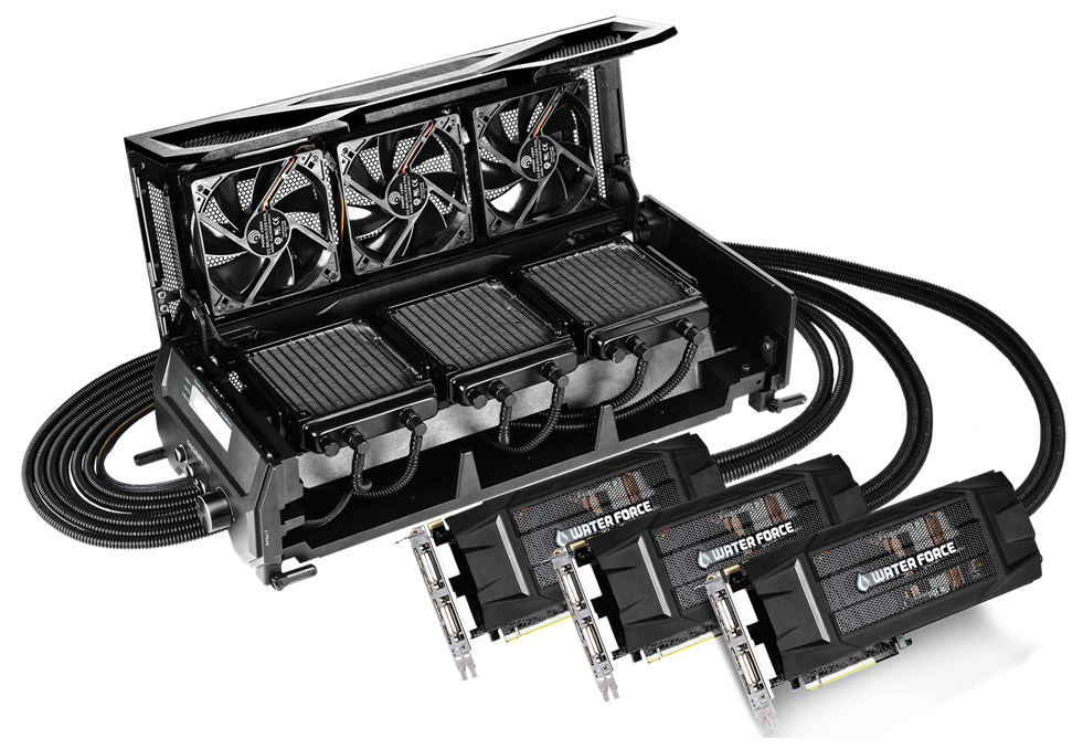 Смелый проект Gigabyte Technology по объединению в одно целое трех мощных одночиповых видеокарт и крупногабаритной СВО воплотился в серийный продукт Gigabyte GV-N980X3WA-4GD. По сравнению с экспонатом Gigabyte Tech Tour 2014 полугодичной давности система получила новые графические ускорители GeForce GTX 980 вместо GeForce GTX 780 Ti.