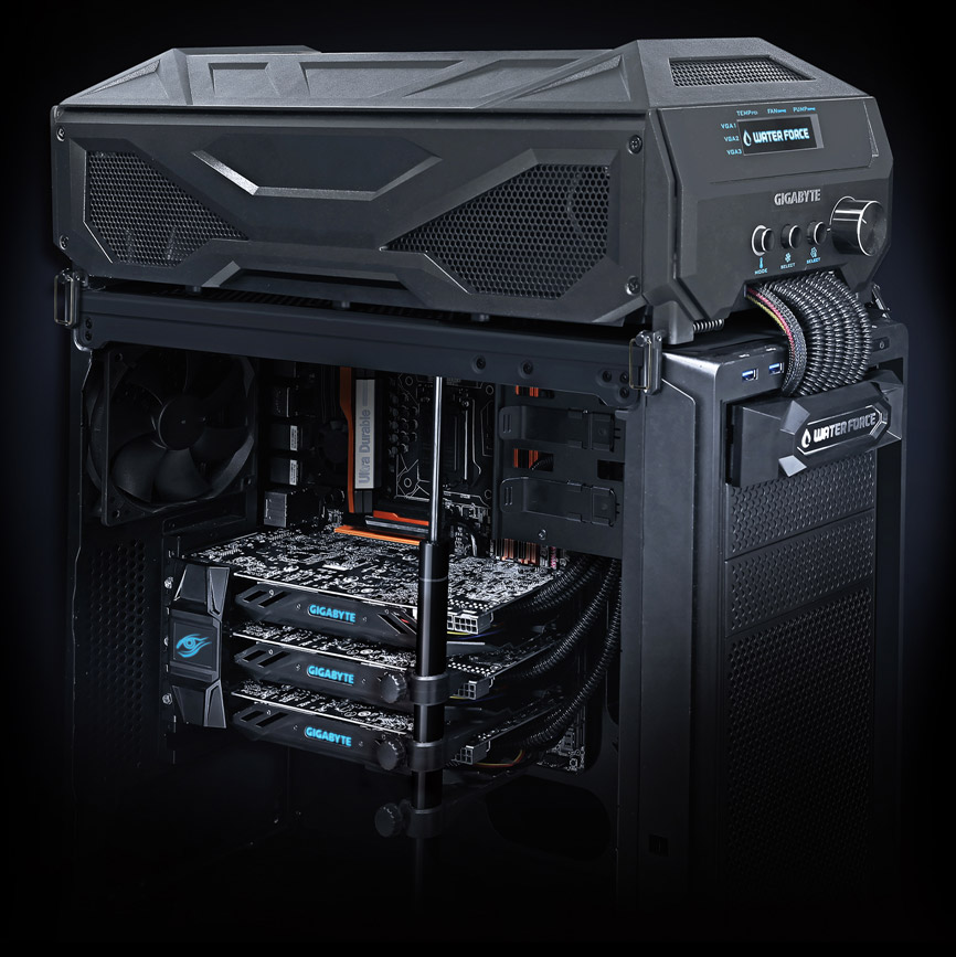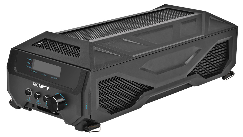 Предложение, разумеется, актуально в основном для Mid- и Full-Tower корпусов с возможностью установки трех двухслотовых видеокарт. Индивидуальные для каждого GPU 120-мм радиаторы помещены в отдельный корпус с информационной панелью, ручками регулировки скорости вентиляторов и производительности помпы.