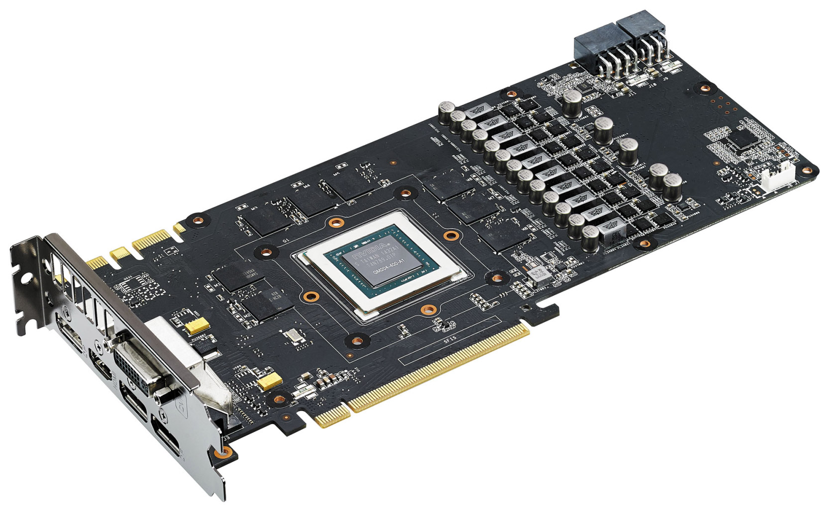 Фаз питания целых десять. Транзисторы VRM имеют собственный теплосъемник, соединенный с испарительной камерой. У края PCB распаяны разъемы дополнительного питания PCI-E Power 6-pin и 8-pin. Кроме прочего, поддерживаются многочиповые конфигурации Nvidia 3-Way и 4-Way SLI.