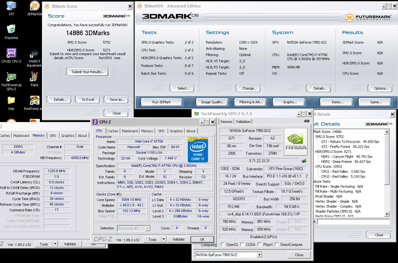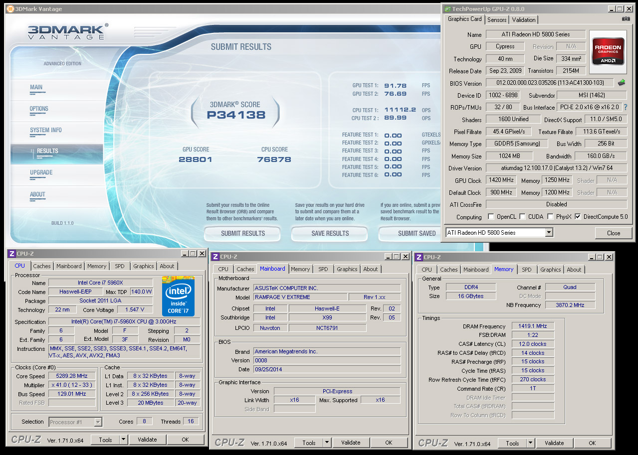 Для того чтобы претендовать на виртуальный золотой кубок HWBot и немало зачетных очков, StrategosSan и Wizerty собрали hi-end систему в составе процессора Intel Core i7-5960X (@5289 МГц), материнской платы Asus Rampage V Extreme, 16 ГБ (4x4 ГБ) оперативной памяти G.Skill Ripjaws 4 DDR4 (@2838 МГц), блока питания Corsair Professional Series Gold AX1200 и других компонентов. CPU и GPU охлаждались жидким азотом.