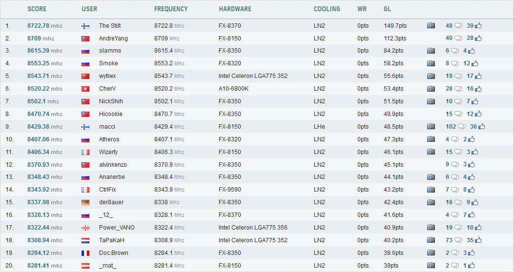 Стенд был основан на материнской плате Asus Crosshair V Formula-Z (чипсет AMD 990FX), а его питание обеспечивал БП Antec High Current Pro 1300W. Все ядра CPU были активны, напряжение на них повышалось до 2,04 В. Ниже приведены 20 лучших результатов в дисциплине HWBot CPU Frequency на сегодняшний день: