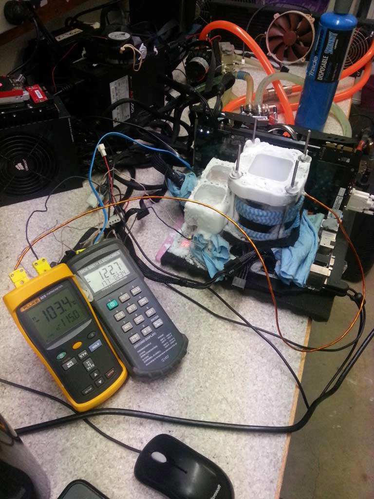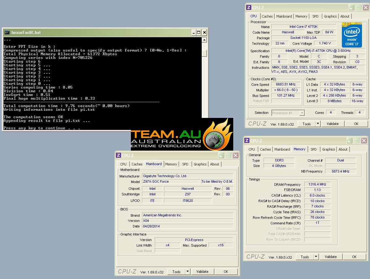 TeamAU использовали отборный экземпляр процессора Intel Core i7-4770K, которому покорилась частота 6683 МГц при напряжении 1,74 В и четырех активных ядрах. Также были задействованы: материнская плата Gigabyte GA-Z97X-SOC Force, два 2 ГБ модуля оперативной памяти DDR3 @2633 МГц с таймингами 6-10-7-26, SSD-накопитель Corsair Force GT, блоки питания мощностью до 1500 Вт и испарители для жидкого азота, спроектированные Петри «SF3D» Корхоненом для компании EK Water Blocks.