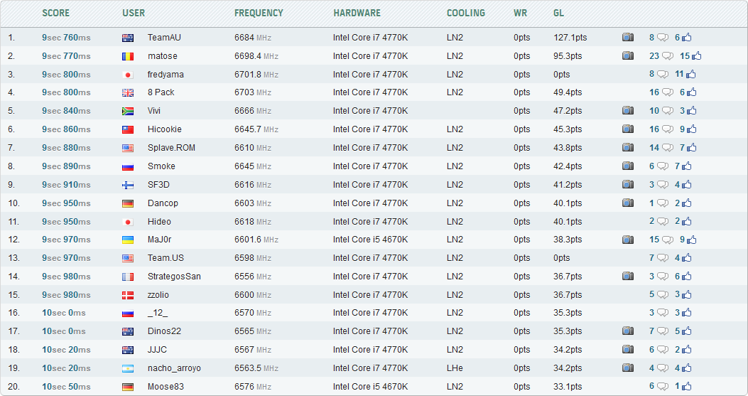 Лучший разгон CPU в данной дисциплине продемонстрировал британец 8 Pack (6703,72 МГц), а лучший результат на относительно скромном процессоре Core i5-4670K — наш соотечественник MaJ0r: