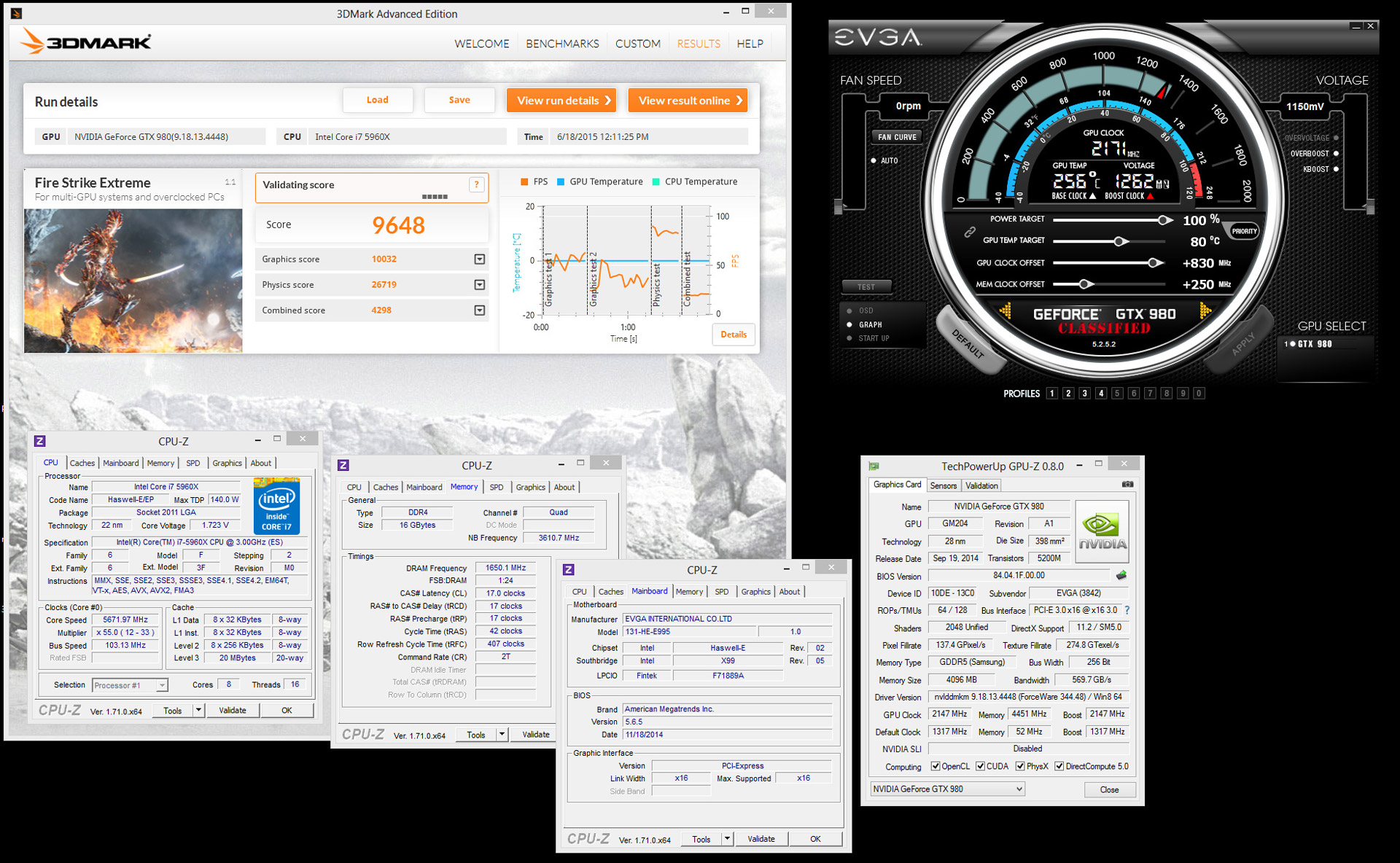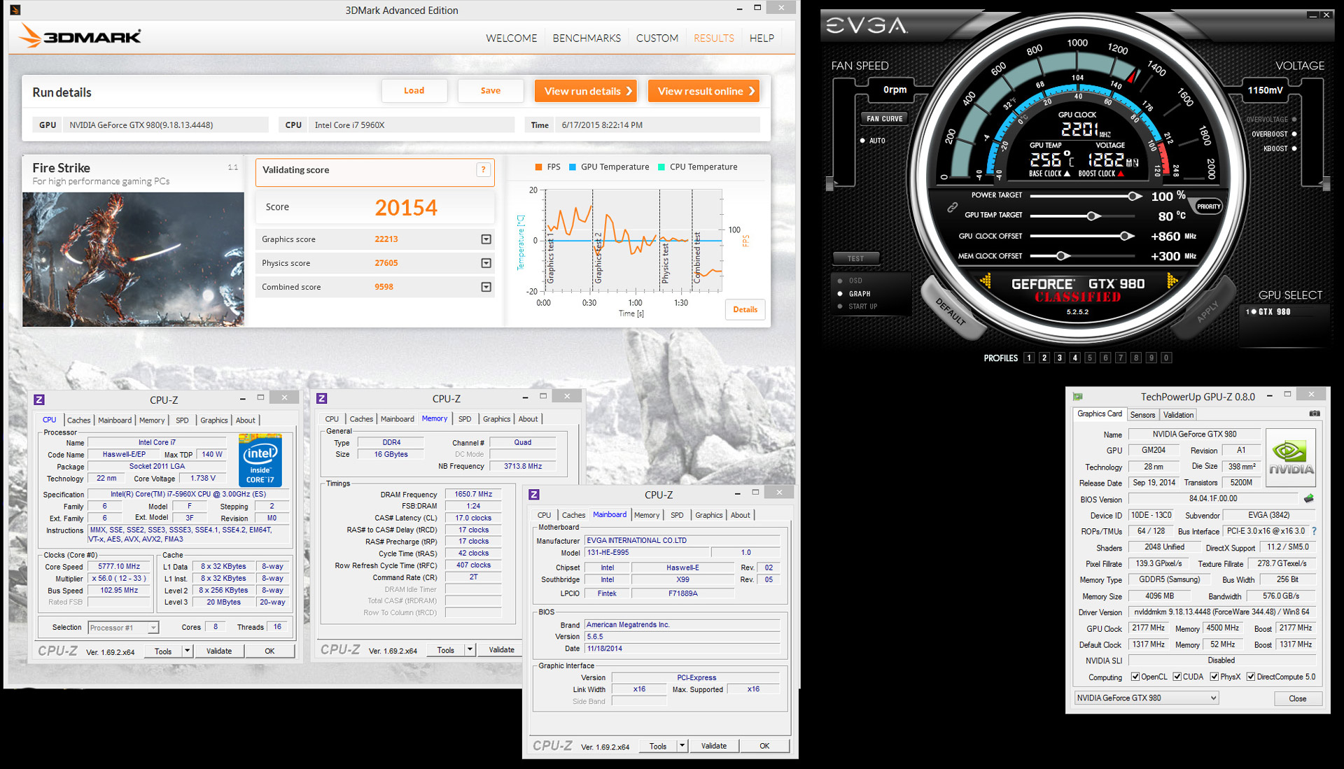Максимальный разгон ядра GM204-400 составил 2201 МГц, частота памяти GDDR5 повышалась до эффективных 8900–9000 МГц. Для бенч-сессии использовалась видеокарта EVGA GeForce GTX 980 Classified. Компанию ей составили: материнская плата EVGA X99 Micro (131-HE-E995-KR), 8-ядерный процессор Intel Core i7-5960X (@5671–5777 МГц), 16-гигабайтный (4x4 ГБ) комплект оперативной памяти G.Skill Ripjaws 4 DDR 4 (@3300 МГц) и два блока питания EVGA SuperNova NEX1500 Classified. На GPU устанавливался испаритель KingpinCooling Tek-9 Fat, а на процессоре — KingpinCooling Dragon F1 Extreme Dark.