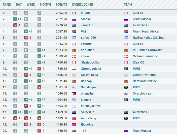 За последний месяц K|ngp|n прибавил семь позиций в HWBot Elite League и вышел на 15 место. Впрочем, для мастера разгона, неоднократно возглавлявшего личный зачет, это сущие пустяки :)
