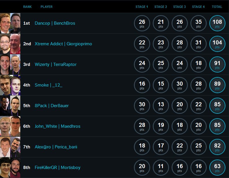 Второе и третье места соответственно заняли интернациональные коллективы Xtreme Addict/Giorgioprimo и Wizerty/TerraRaptor. Им достались соответственно $3000 и $2000. Лишь к третьей стадии смогли вывести стенд на «проектную мощность» россияне Smoke и 12. Финишный спурт принес им 4 место. Разочарованием закончился турнир для 8 Pack и Der8auer: после успеха в Cinebench R15 (2188 очков) им не удалось ни разу попасть в тройку лучших в графических бенчмарках. Набрав 85 зачетных баллов, Иан и Роман поделили 5-6 места с John_White и Maedhros.