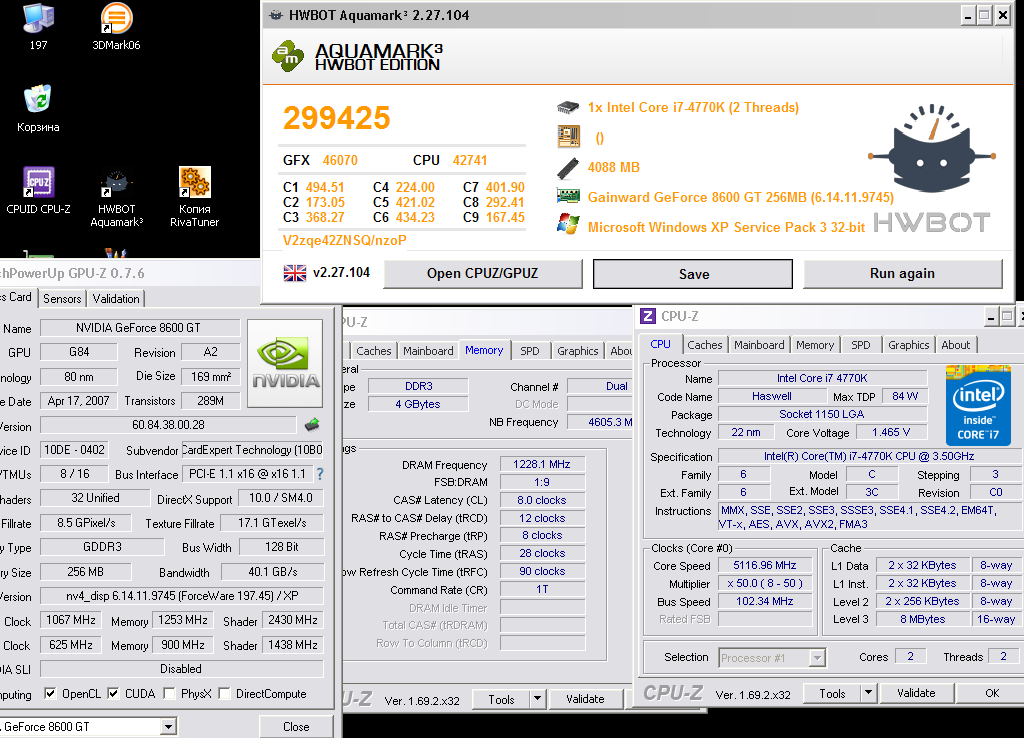 Ключевыми компонентами системы являлись: разогнанная до 1067/2430/2506 МГц (ядро/шейдерный домен/память) видеокарта Gainward GeForce 8600 GT с допаянным модулем EVGA EPower, процессор Intel Core i7-4770K (@5117 МГц, 1,465 В), материнская плата серии Asus Republic of Gamers и два 2 ГБ модуля оперативной памяти G.Skill DDR3 @2456 МГц (тайминги 8-12-8-28). Графический и центральный процессоры охлаждались посредством СВО.