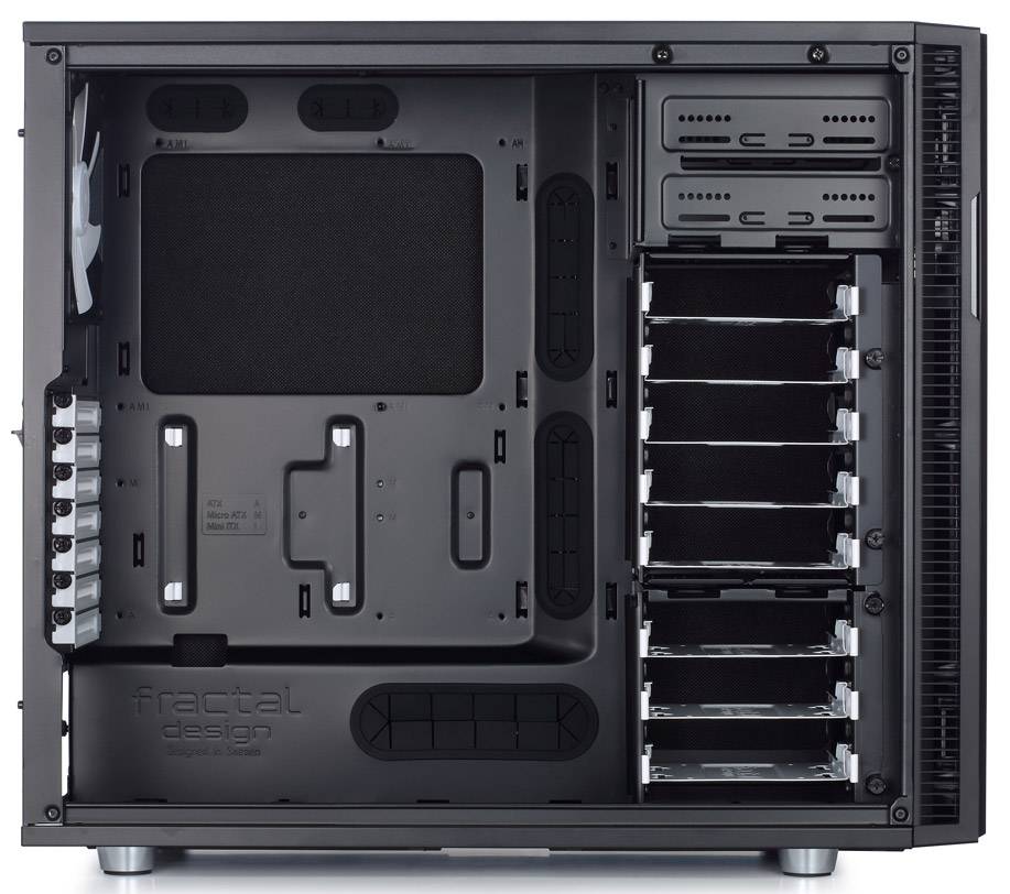 Представители семейства Fractal Design Define R5 поддерживают установку материнской платы форм-фактора ATX, microATX или Mini-ITX, ATX-совместимого блока питания, семи карт расширения PCI-E длиной до 310–440 мм (в зависимости от количества корзин с HDD), процессорного кулера высотой до 180 мм, двух оптических приводов и восьми 3,5- либо 2,5-дюймовых HDD/SSD. Дополнительные 2,5" накопители в количестве 2 шт. можно закрепить с тыльной стороны поддона для материнской платы.