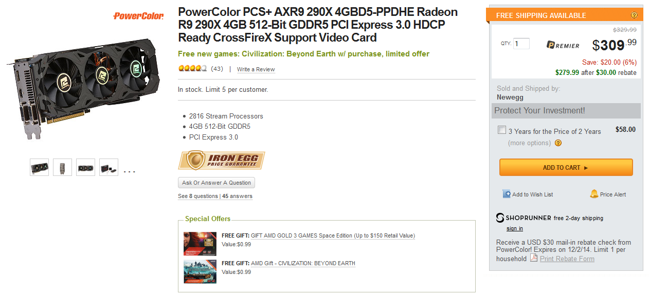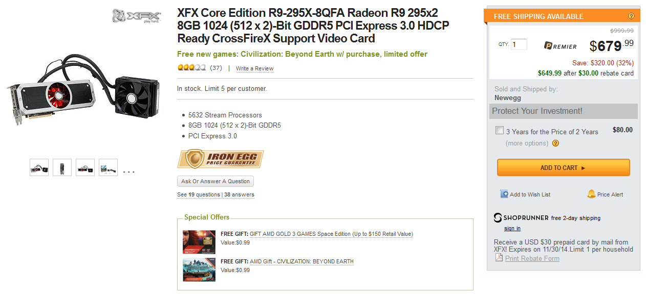 В эти дни американские интернет-магазины Amazon и Newegg предлагают двухчиповую видеокарту XFX Radeon R9 295X2 по весьма демократичной цене — 650 долларов с учетом рибейта ($30). Заокеанским покупателям, конечно, придется дополнительно заплатить небольшой налог с продаж, однако при этом гарантируется бесплатная доставка устройства и копия игры Sid Meier's Civilization: Beyond Earth.