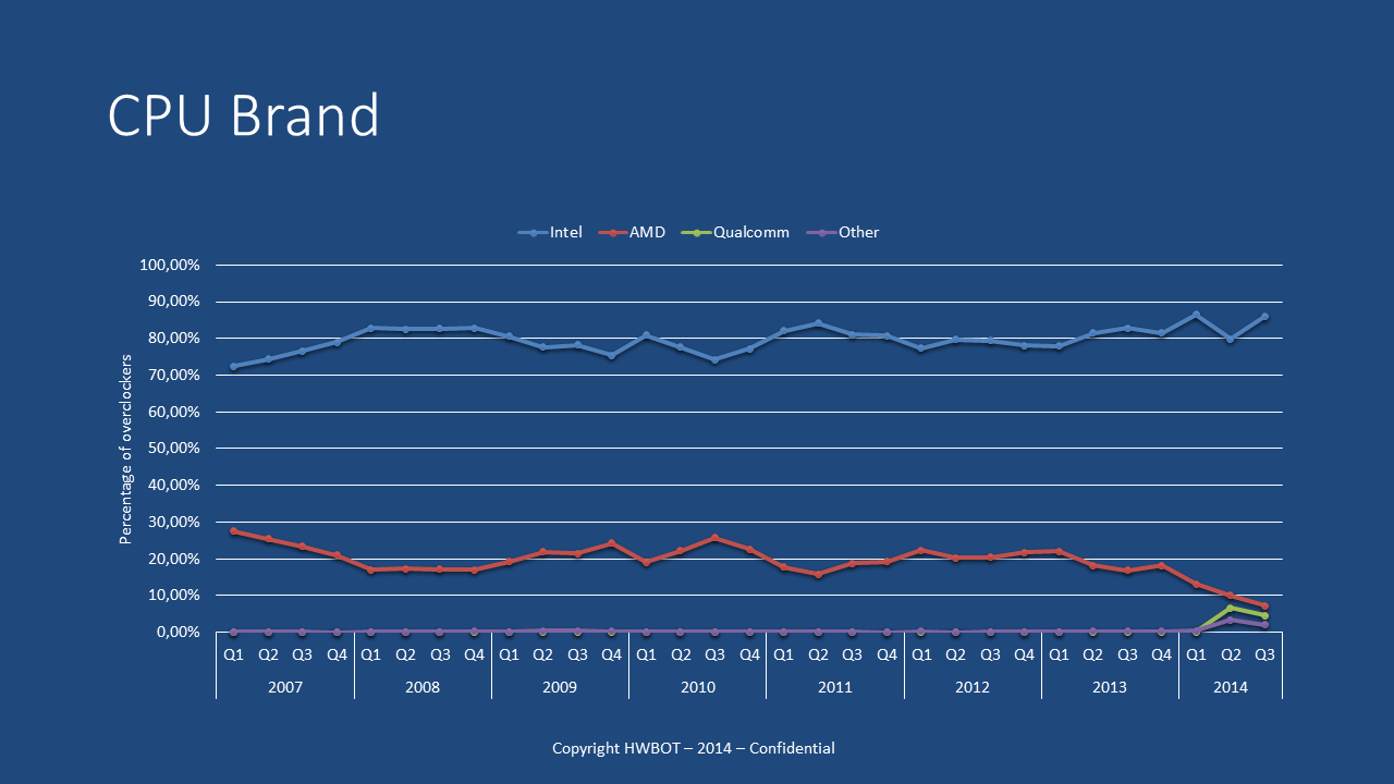 Частота использования процессоров Intel выросла с 80% до 86%, а AMD уже пора переживать по поводу мощного конкурента в лице Qualcomm.