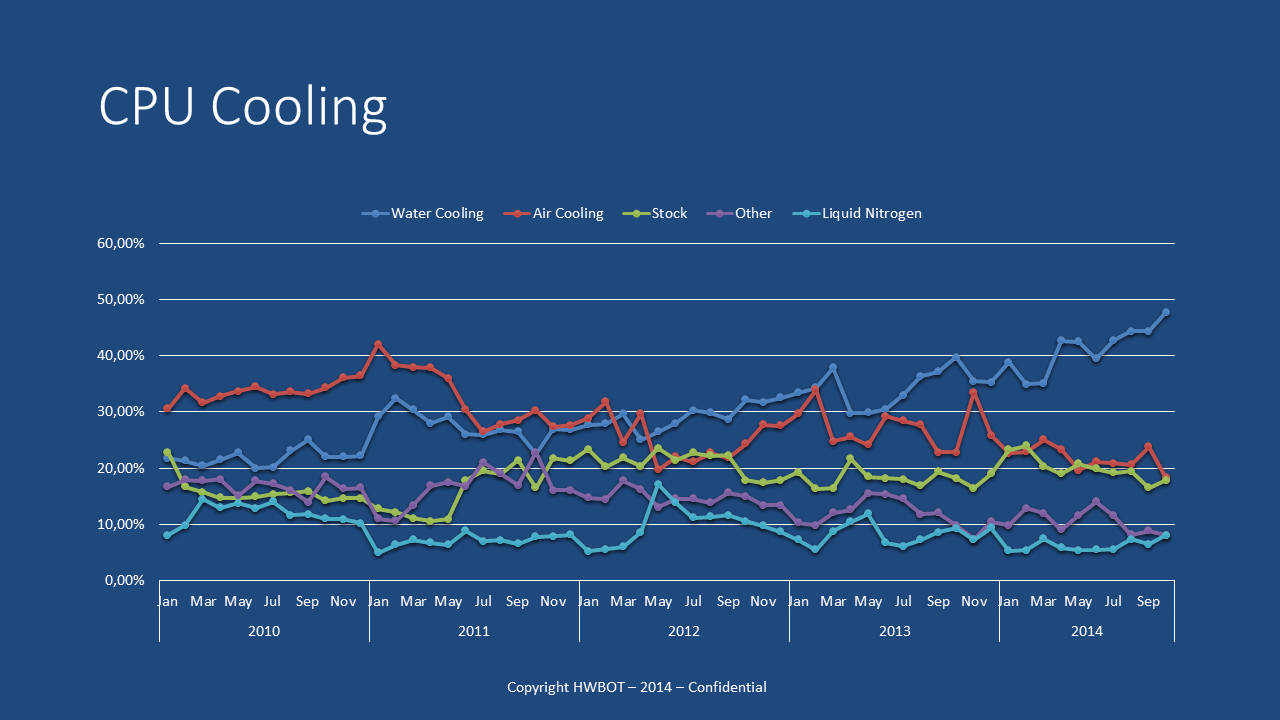Почти 50% оверклокеров применяют жидкостное охлаждение компонентов системы. Данный подход весьма эффективен для multi-GPU систем, старого «железа» и некоторых бенчмарков, в основном технологически отсталых. Примечательно, что штатное охлаждение используется вдвое чаще жидкого азота. Популярность последнего редко превышает 10% в последние годы.