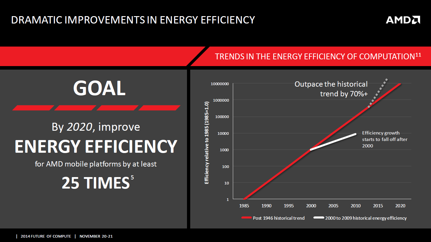 Если верить недавно опубликованным слайдам, до 2020 года энергоэффективность мобильных APU от AMD вырастет как минимум в 25 раз. В настольном сегменте прогресс, вероятно, будет не столь впечатляющим.