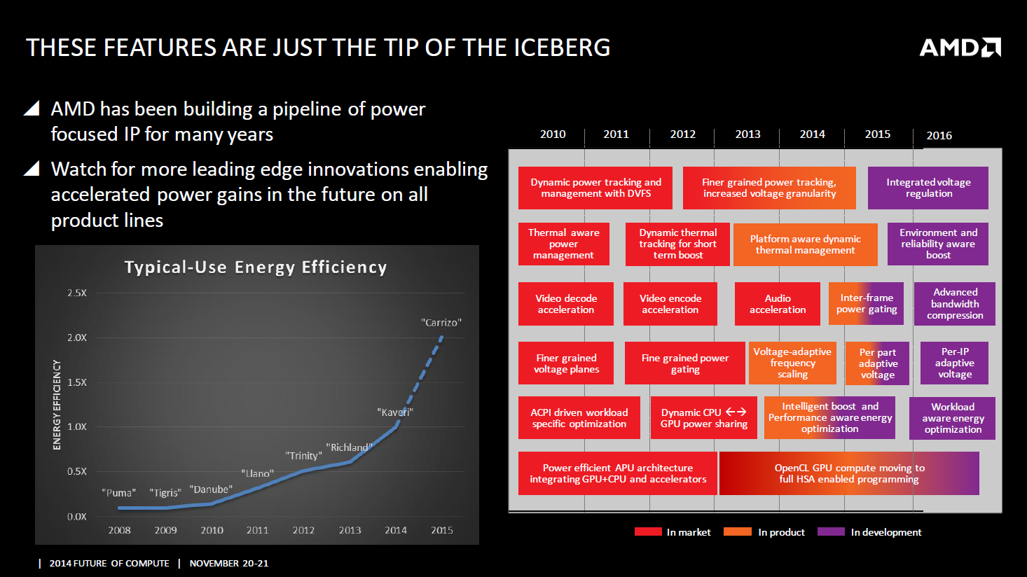 В готовящихся APU будет реализован встроенный контроллер напряжения, гибкий турборежим, зависящий от приложения, более экономичный блок аппаратного ускорения видео, тонкая регулировка напряжений на различных узлах процессора и другие технологии. Немалая роль отведена развитию экосистемы HSA.