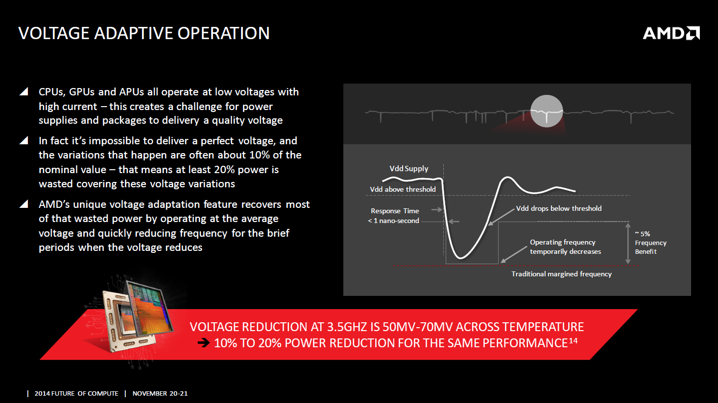 Адаптивное напряжение позволит уменьшить Vcore новых APU на 50–70 мВ за счет мгновенного кратковременного снижения частоты в ответ на просадку напряжения, которое при обычном подходе вызывает «мертвое» зависание системы. Время реагирования — менее 1 нс.