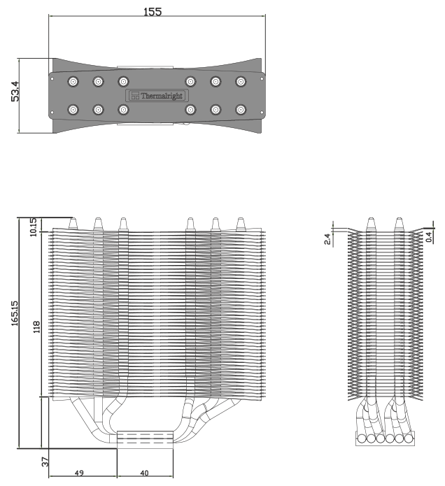 Конструкция кулера включает медное никелированное основание (медь марки C1100), шесть медных никелированных тепловых трубок диаметром 6 мм, массив алюминиевых пластин и вентилятор нестандартных размеров (152x140x26,5 мм) с креплением в виде проволочных скоб.
