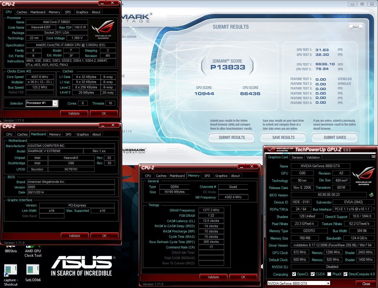 После допайки питающей платы EVGA EPower и установки «стакана» для жидкого азота карта 8800 GTX смогла покорить частоты вплоть до 984/2403/2592 МГц (ядро/шейдерный домен/память). Стенд включал процессоры Intel Core i7-4770K и Core i7-5960X (только для 3DMark Vantage), разогнанные до 6,2 ГГц и 4,5 ГГц соответственно.