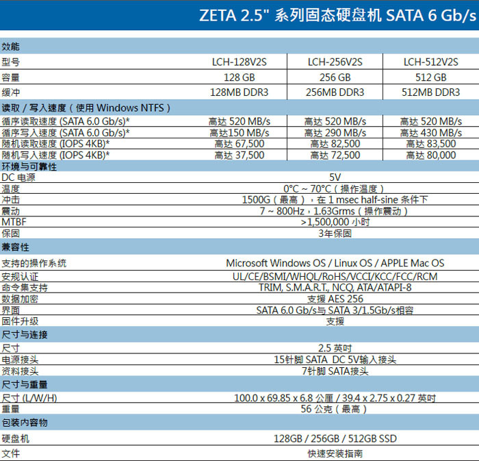 SSD объемом 128 ГБ (LCH-128V2S), 256 ГБ (LCH-256V2S) и 512 ГБ (LCH-512V2S) оснащены 128–512 МБ буферной памяти DDR3 и обеспечивают производительность вплоть до 83500/80000 IOPS (чтение/запись), а также характеризуются скоростями последовательных чтения и записи в 520 МБ/с и 150–430 МБ/с соответственно. Самый высокий уровень быстродействия — у старшей модели: