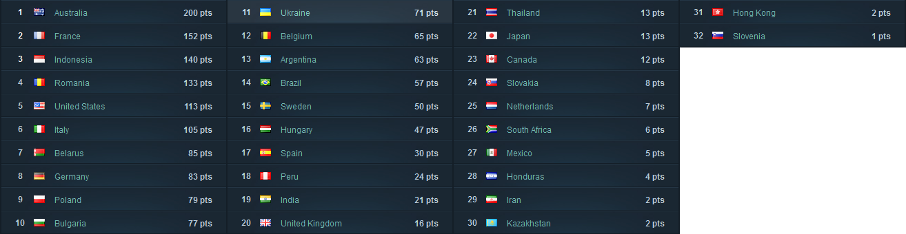 20 декабря на HWBot завершился традиционный и, надо отметить, весьма престижный оверклокерский турнир Country Cup — командный чемпионат мира по разгону на уровне стран. Сразу скажем, что вполне прогнозируемо дружные и не обделенные финансово австралийцы не оставили шансов конкурентам, набрав «гроссмейстерские» 200 очков. Почти на 50 пунктов от них отстали французы, следом финишировали оверклокеры из Индонезии, Румынии и США. Большой сюрприз преподнесли белорусы, занявшие высокое 7 место и оставившие позади команды Германии, Польши и Болгарии.