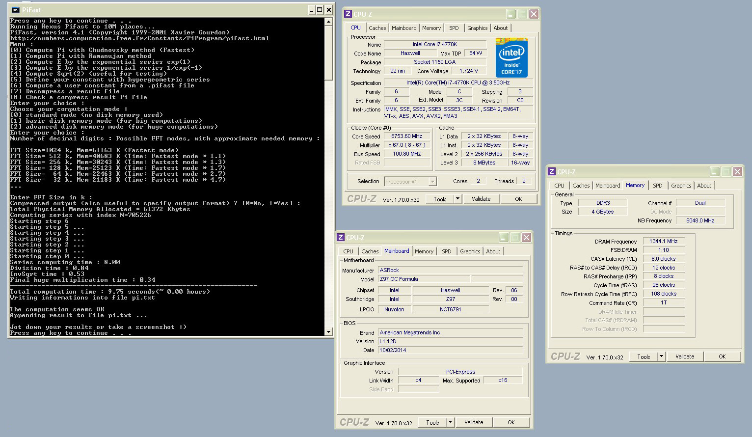 Процессор работал с двумя активными ядрами и с выключенным Hyper-Threading. Для достижения частоты в 6753 МГц потребовалось, кроме прочего, повысить напряжение до 1,72 В. Память G.Skill Pi функционировала в режиме DDR3-2688 (задержки 8-12-8-28).
