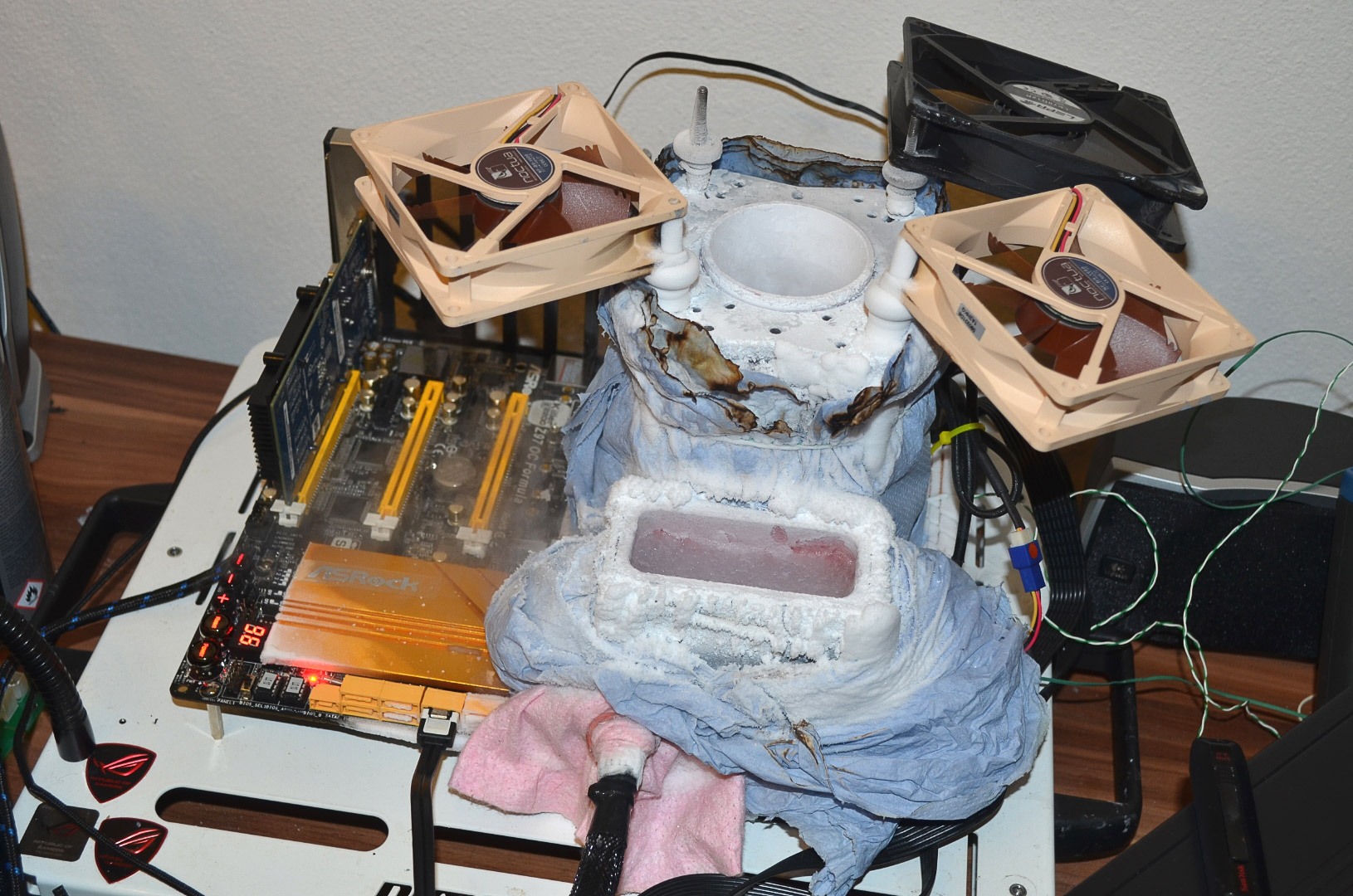 В системе также использовались: материнская плата ASRock Z97 OC Formula, блок питания Seasonic номиналом 1200 Вт, дискретная видеокарта и испарители для жидкого азота (на процессоре и модулях памяти).